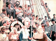 La toldilla del velero, arreglada para la ocasión, fue el escenario que volvió a reunir, en un ambiente, ya, completamente relajado, a los asistentes del 42. Algunos con esposas e hijas, ¡todas lindas por cierto! Todos con esa alegría, que brota a borbotones, cuando las emociones se confabulan con la nostalgia y se aglutinan en momentos que serán eternos en la memoria, porque han sido gestados en el corazón y son la celebración, el ritual que conmemora lances que forjaron nuestra existencia, de una forma tal, que trasmutó la escoria de ser recluta en la "gloria" del comandante, del hidalgo, del "caballero del ancho mar". Un audiovisual, proyectado sobre una pantalla colocada en la toldilla, con una excelente edición de Pedro Mendoza, nos hizo un recuento de los viejos y los nuevos tiempos, 1967… 2007, los reclutas, el ministro, el comandante, los reclutas que dejaron de ser vencejos, para demostrarse a sí mismos que no hay nada más despojado que un recluta, ni nada más glorioso, que de haberlo sido, volar, cual águila caudal.